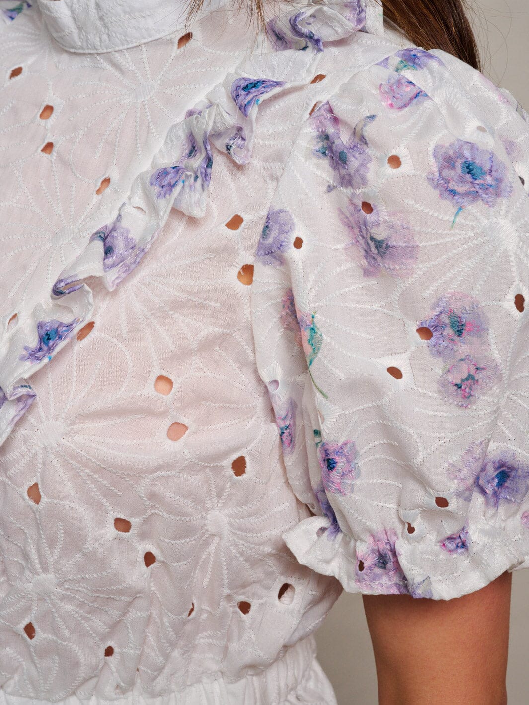 This elegant women's blouse features short puff sleeves and a mock neck, offering a romantic and vintage-inspired look. The blouse is adorned with a delicate floral pattern and eyelift details, adding a touch of femininity and charm. The ruffle trim at the hem and sleeves enhances its whimsical appeal, while the back keyhole closure provides a subtle yet stylish detail. Made from lightweight and breathable fabric, this top is perfect for casual outings, garden parties, or any occasion where you want to look effortlessly chic.